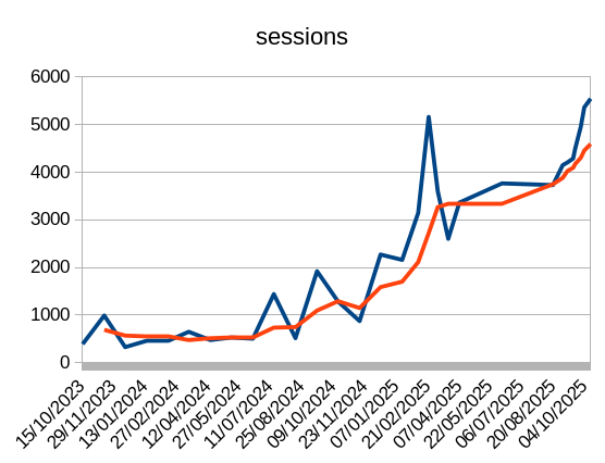 The blue line is the chart of visitors to the 21 Group blog site (sessions per month versus date). Each of these sessions has on average 3-5 page views. The red line is three-month rolling average.